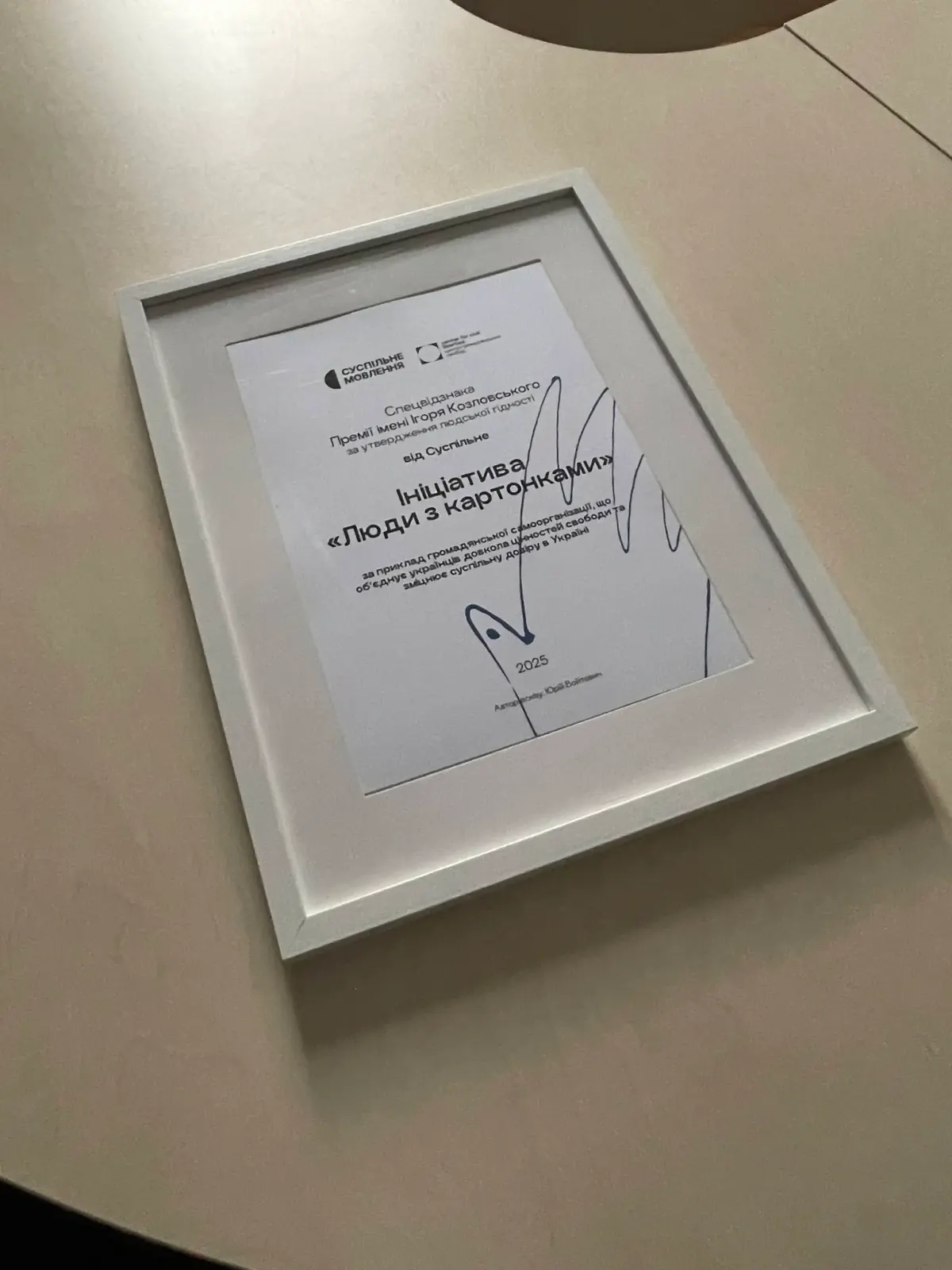 Наша колекція поповнилася новим експонатом – Спецвідзнакою від Суспільного Мовлення, переданою нам представниками ініціативи “Люди з картонками”. Вони отримали її 10 грудня (у Міжнародний день прав людини) у межах Премії імені Ігоря Козловського, названої ЦГС на честь українського громадського діяча, який провів 700 днів у неволі на тимчасово окупованій території.