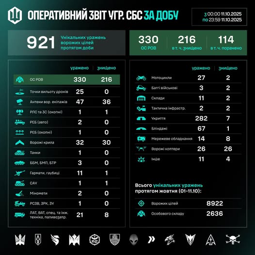 Загалом упродовж жовтня (01–11.10) знищено/уражено 8922 ціль, з них 2636 – особовий склад противника.