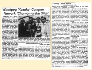 14–15.02.1976 – у Нью-Йорку, в США, відбулися два товариські хокейні матчі між українськими студентськими командами «Козаки» з Вінніпегу та «Чорноморська Січ» з Нью-Йорка. «Козаки» на виїзді двічі здобули перемогу з рахунком 5:2 і 9:0. У тій грі взяли участь: Й. Когут, Нестор Будик (воротар), П. Пиробик, М. Давидовський, П. Базан, С. Головка, Роман Грабович (капітан), Мирослав Затварницький, Д. Лега, М. Кузик, З. Романюк, Б. Тимо, Й. Берчолук – типові «небританські» прізвища. Команда «Козаки» тричі поспіль вигравала Університетську лігу (University Intramural League) у сезонах: 1974/75, 1975/76, 1976/77.