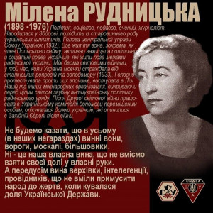 29.03.1976 – у Мюнхені померла Мілена Рудницька – журналістка, письменниця. Учителька середніх шкіл, ідеолог жіночого руху Західної України, голова центральної управи Союзу Українок, Світового Союзу Українок, політичної жіночої організації «Дружина Княгині Ольги». Діячка УНДО, посол до польського сейму, громадська діячка на еміграції. Народилася у Зборові на Тернопільщині 1892.