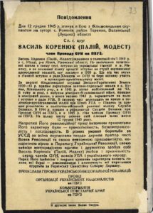 Василь Коренюк-«Палій; Модест». Закінчив українську гімназію у м. Рівне, член Юнацтва ОУН. Закінчив студії православної теології у Варшаві (1938). Вчитель фізкультури, згодом директор неповно-середньої школи в с. Кунин Мізочського (Здолбунівського) району (1939-1941). Одружений з дочкою священника Вірою Федотовою (1939). Мобілізований до Червоної армії (1941), потрапив у німецький полон. Навесні 1943 вирвався з полону та вступив в УПА. Працівник політично-пропагандивного відділу штабу УПА-Південь (ВО «Богун») та одночасно відділу політично-військової розвідки відділу СБ. Учасник бою під Гурбами. Працівник референтури СБ проводу ОУН на ПЗУЗ (1944), член проводу ОУН на ПЗУЗ (1945). Лицар Срібного Хреста Заслуги. Народився у с. Уїздці на Рівненщині 1919.