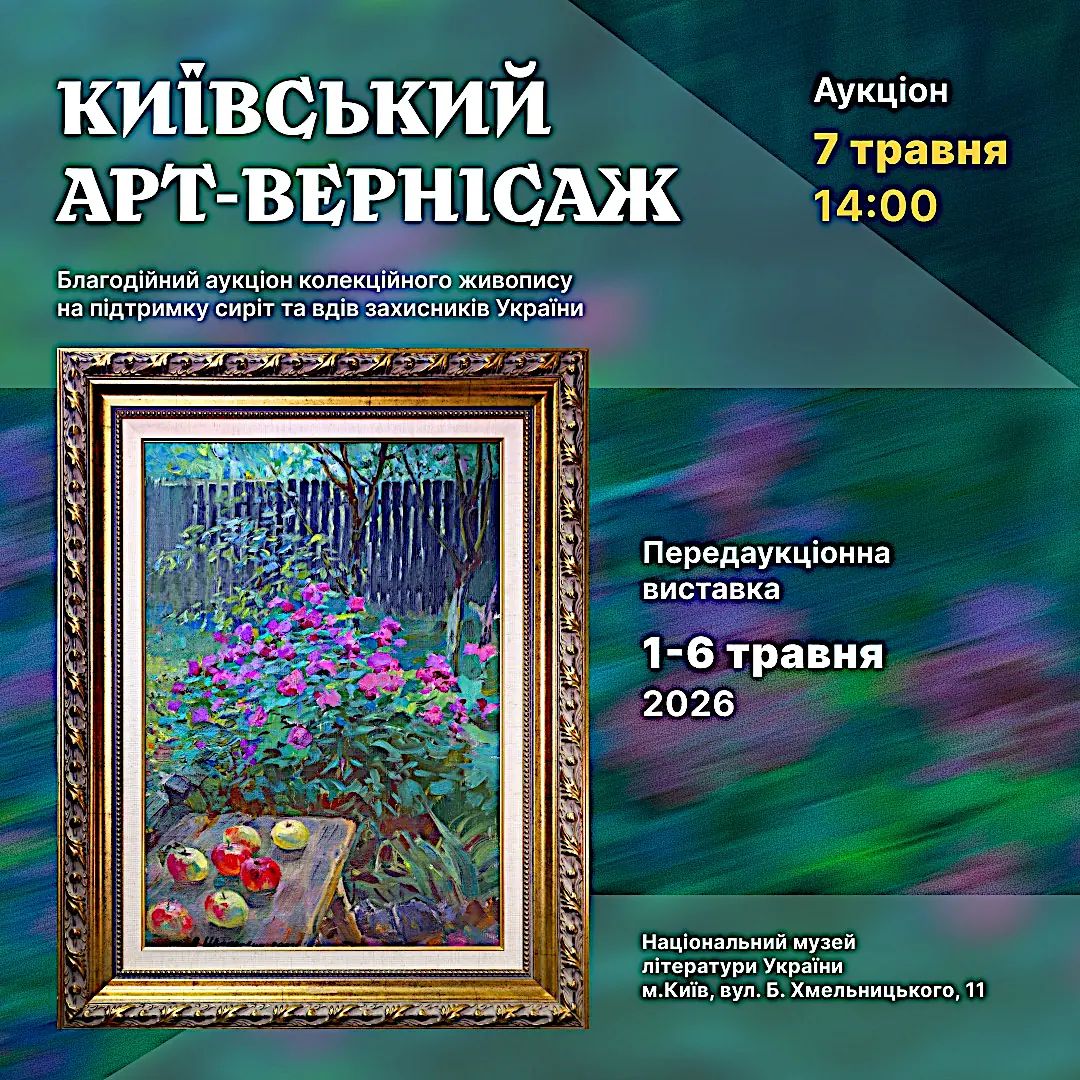 Аукціон відбудеться 7 травня 2026 року у Національному музеї літератури України (вул. Б.Хмельницького, 11). Початок о 14.00.