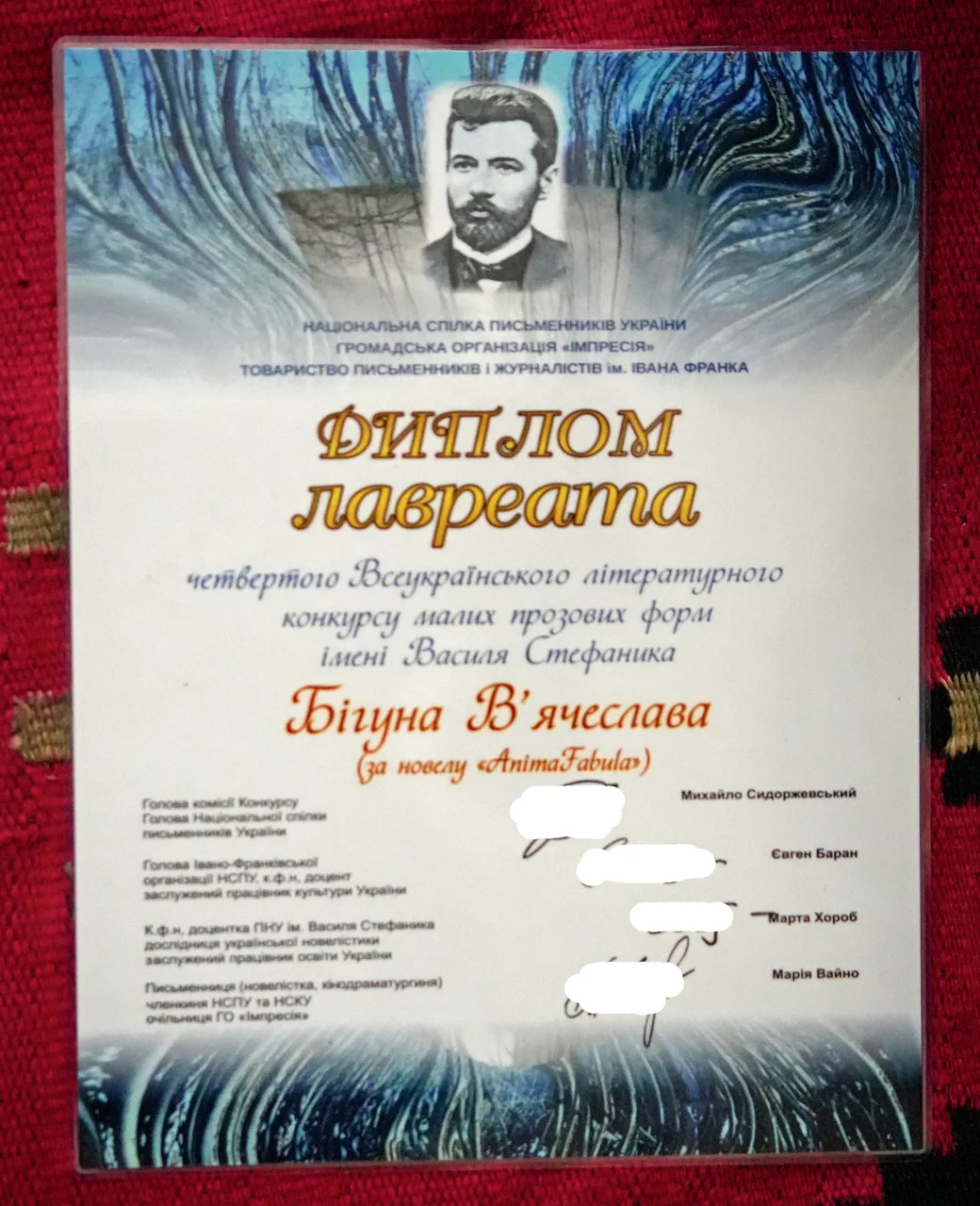 В Україні урочисто нагородили лауреатів IV Всеукраїнського конкурсу малих прозових форм імені Василя Стефаника. За інформацією Суспільного, журі визначило переможців серед майже півсотні учасників із різних регіонів країни та з-за кордону. Серед лауреатів — режисер і науковець В’ячеслав Бігун, який отримав відзнаку за свою новелу «AnimaFabula». Цей твір, на думку журі, гідний визнання в одному з найпрестижніших конкурсів малої прози країни.