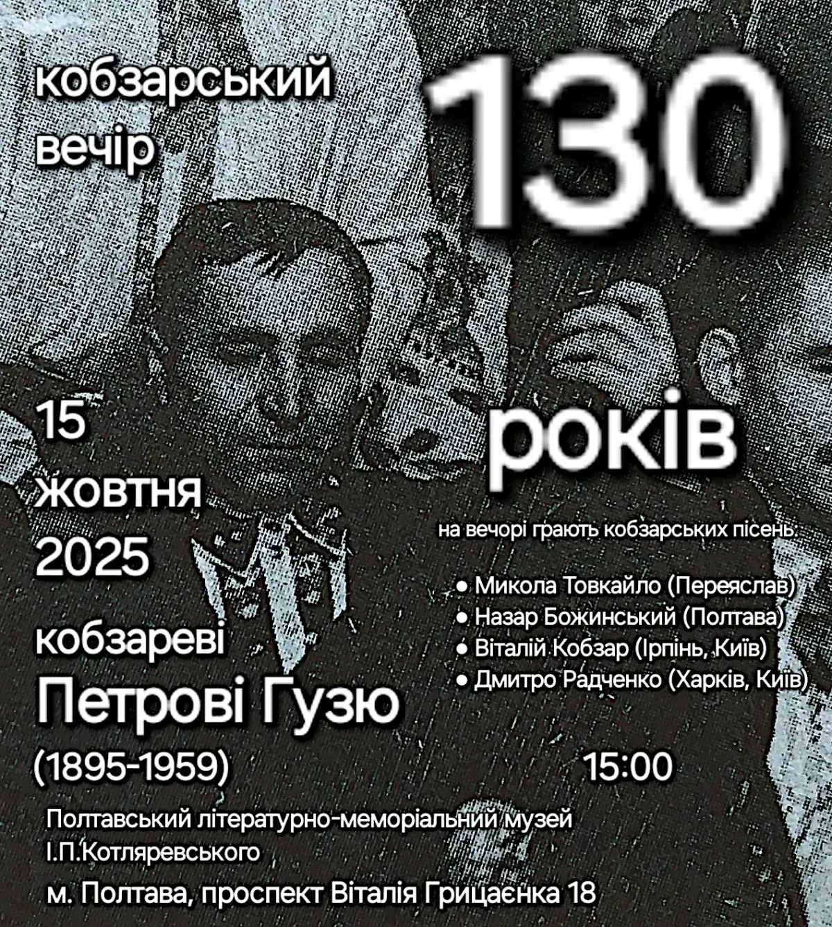 15 жовтня у Полтавському літературно-меморіальному музеї Івана Котляревського відбувся культурно-мистецький захід з нагоди 130-ї річниці від дня народження одного з визначних майстрів кобзарського мистецтва Петра Гузя. На зібрання «Кобзарський вечір. 130 років Петрові Гузю» завітали сучасні кобзарі з Переяслава, Ірпеня, Києва, Полтави, краєзнавці, громадські діячі, музикознавці, музейники та представник Українського інституту національної пам’яті в Полтавській області Олег Пустовгар.