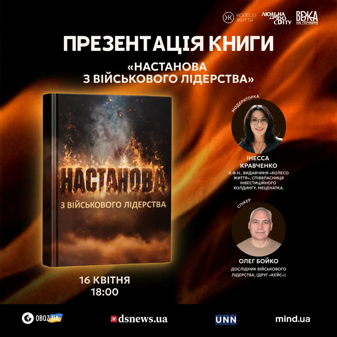 В умовах екзистенційної боротьби за незалежність лідерство перестає бути просто посадою і стає питанням виживання. Провідні військові експерти та бойові офіцери (Олег Бойко, Михайло Драпатий, Геннадій Верхоланцев, Михайло Цимбал, Віктор Шидлюх) презентують видання «Настанова з військового лідерства» — предметний інструментарій, що готує свідомість людини до викликів сучасності. Презентація відбудеться 16 квітня у Вежі на Почайні. Книга вийшла у видавництві “Колесо життя”. Подія здійснюється за підтримки проєкту Людина Диво Світу.