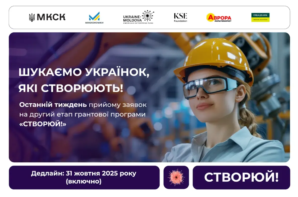KSE Foundation оголошує завершальний етап прийому заявок на грантову програму «СТВОРЮЙ!» — ініціативу, спрямовану на підтримку українок, які розвивають бізнес у виробничій, переробній та креативній сферах із виробничою складовою. Подати заявку можна до 31 жовтня 2025 року включно. Загальний бюджет програми перевищує $1 000 000, а максимальний розмір гранту становить $15 000.