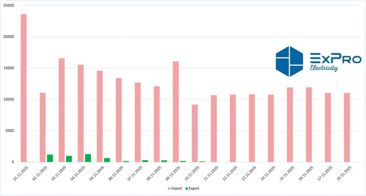 Імпорт та експорт електроенергії у листопаді 2025 року, МВт*год за добу