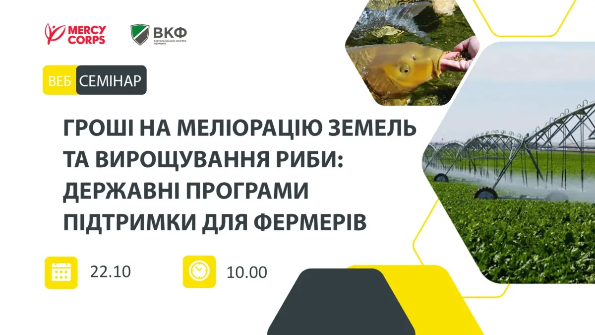 Всеукраїнський конгрес фермерів у межах Програми підтримки фермерів, яку реалізовує у партнерстві з міжнародною гуманітарною організацією MERCY CORPS проводить вебінар на тему: «Гроші на меліорацію земель та вирощування риби: Державні програми підтримки для фермерів».