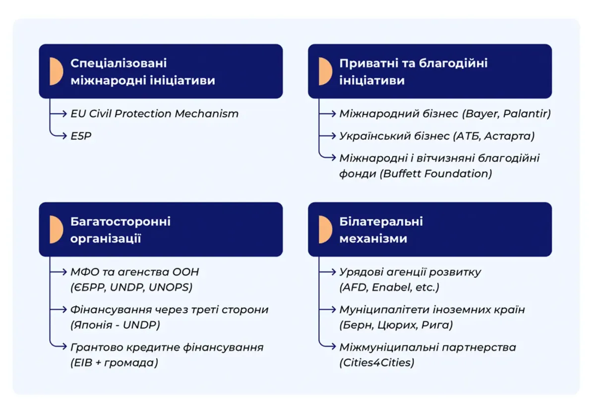 Цей перелік показує, що спектр донорів є надзвичайно широким: від великих міжнародних організацій до локальних муніципалітетів і бізнесу. Саме така різноманітність створює можливості для гнучкого залучення ресурсів у громади з різними потребами.