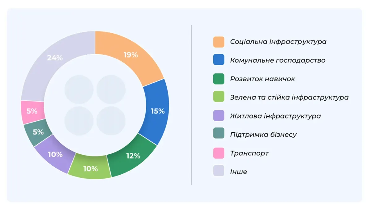 - Соціальна інфраструктура — відновлення шкіл, дитсадків, лікарень, облаштування укриттів;