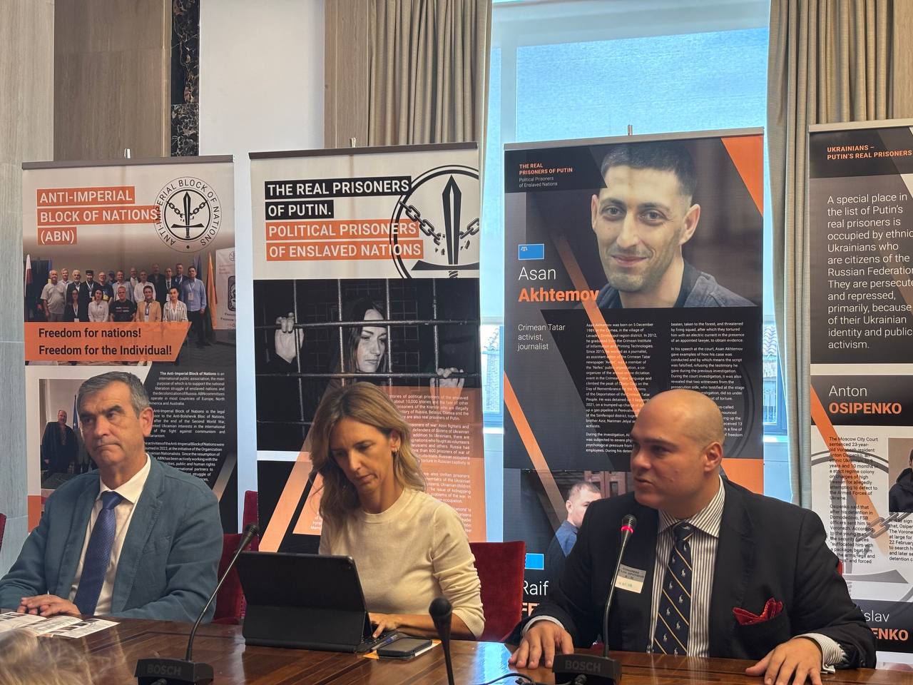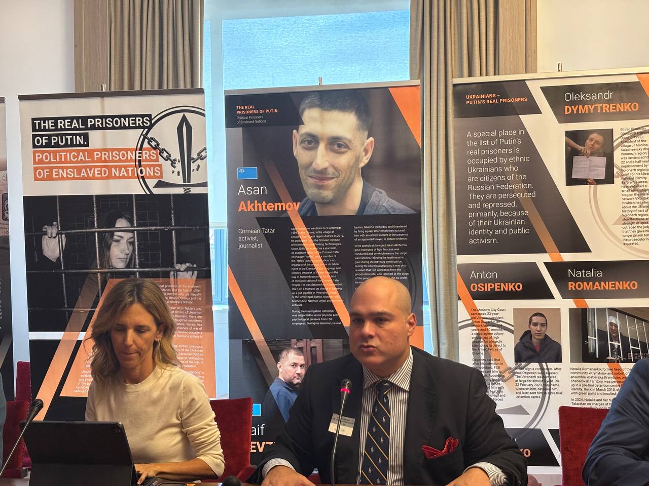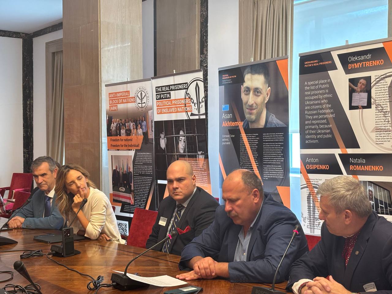 Виконавчий директор АБН Олег Вітвіцький ознайомив присутніх із матеріалами тематичної виставки проекту. “Особливе місце у списку справжніх в’язнів путіна займають представники національно-визвольних рухів поневолених народів, – повідомив Олег Вітвіцький. – Це активісти із Північного Кавказу, Ідель-Уралу, Далекого Сходу, Карелії, Ойрат-Калмикії та інших регіонів. Адже, окрім вимоги зупинити війну, вони проголошують ідею права власних народів на самовизначення та свободу, тобто відділення від росії. А це найбільше лякає кремлівського вождя. Путін прекрасно розуміє, що після виходу на волю, вони отримали б усі шанси очолити національно-визвольну боротьбу своїх народів. Саме тому він не пропонує їх до існуючих “списків на обмін” в’язнями чи полоненими, намагаючись знищити їх морально і фізично за тюремними гратами.