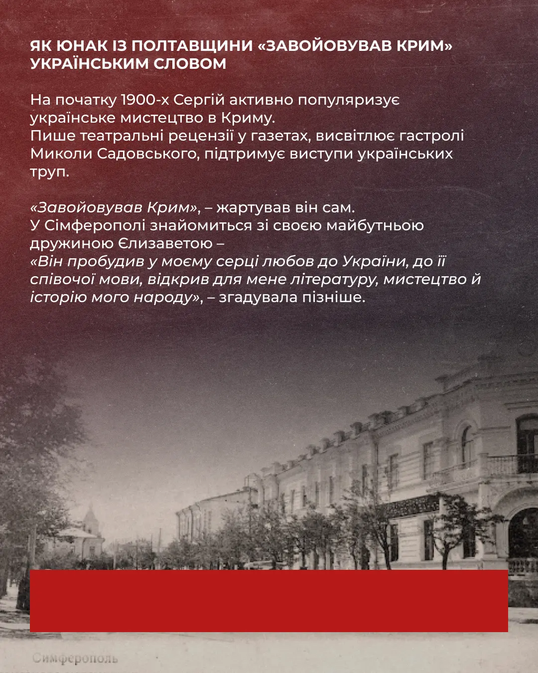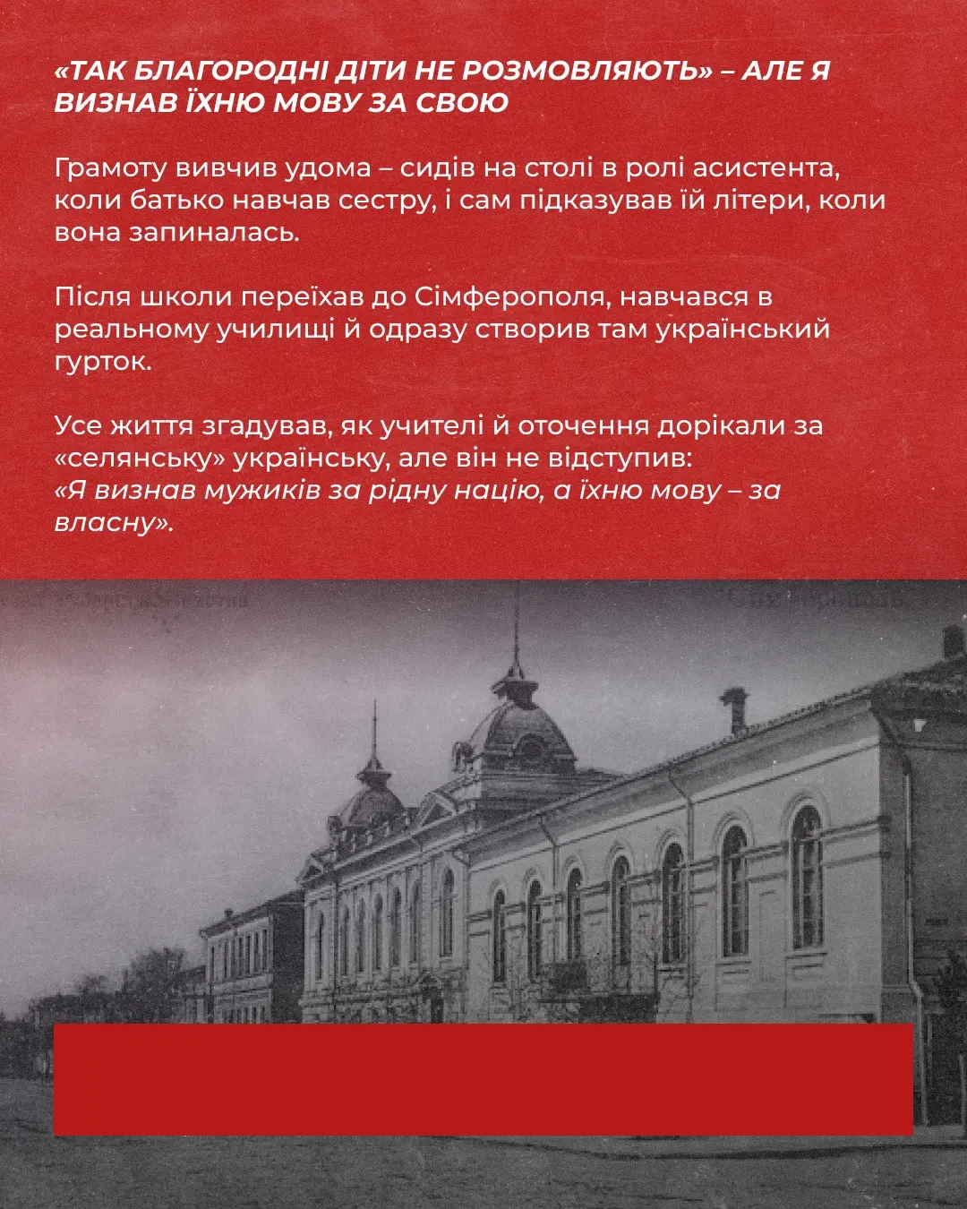 Щоб дізнатись, як із кобеляцького хлопчика виріс митець, якого не зламали дві імперії, читайте і дивіться просвітницький слайдер, що створений Українським інститутом національної пам’яті разом Представництвом Президента України в Автономній Республіці Крим.