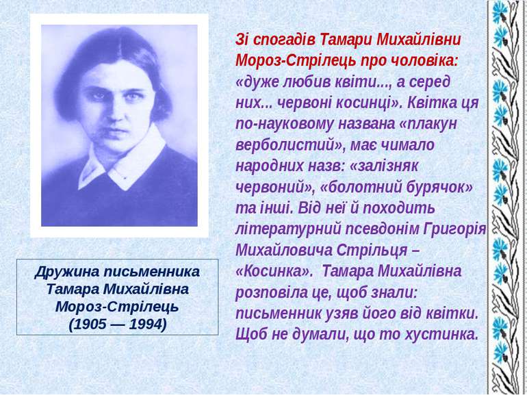 Всі довгі роки штучного викреслення Григорія Косинки з історії української літератури вірною прихильницею його творчості, ревною хранителькою пам’яті про митця залишалася його вдова Тамара Мороз-Стрілець.