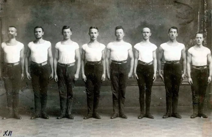 Учительський відділ товариства “Сокіл-Батько” у Львові. Зліва направо: проф. І. Боберський – провідник відділу, Степан Гайдучок, Тарас Франко, Омелян Гузар, Петро Франко, Іван Ігнат, Олесандр Довбенко, Ігор Федів. Весна 1913 р.