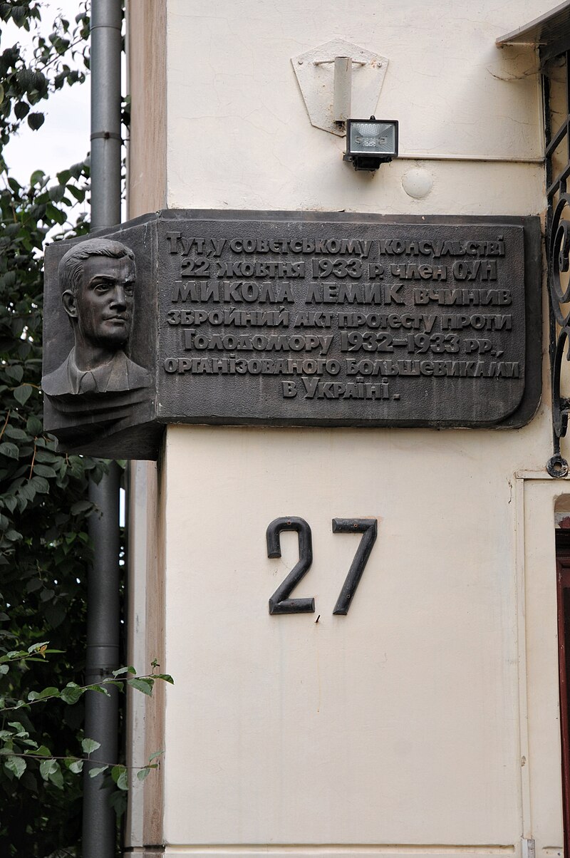 Барельєф памяті Миколи Лемика на фасаді будинку що на вул Котляревського у місті Львові де застрелив Майлова
