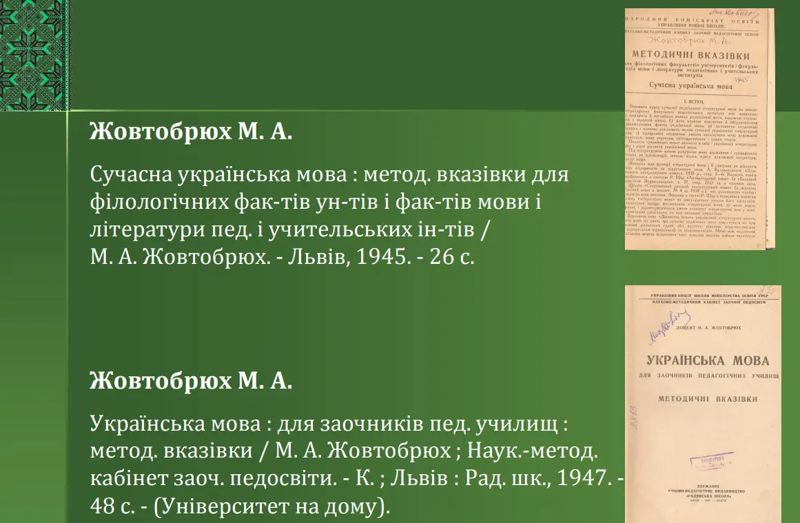 Активною була робота над методичним супроводом до лінгвістичних дисциплін. Вирізнимо в цьому огромі передусім методичні вказівки, навчальні матеріали для студентів стаціонару й заочної форми до цілих курсів або окремих їхніх розділів: «Сучасна українська мова» (К. : Рад. школа, 1940. – 28 с.; 1946. – 26 с.; К. ; Львів : Рад. школа, 1948. – 72 с.), «Лексика сучасної української літературної мови» (К. : Рад. школа, 1949. – 24 с.), «Курс сучасної української мови з елементами історії» (К. : Рад. школа, 1949. –50 с.), «Сучасна українська літературна мова. Вступ. Лексика і фразеологія. Фонетика» (К. : Рад. школа, 1962. – 132 с.) та ін. Цими ґрунтовними та доступними працями користуються й сучасні студенти.