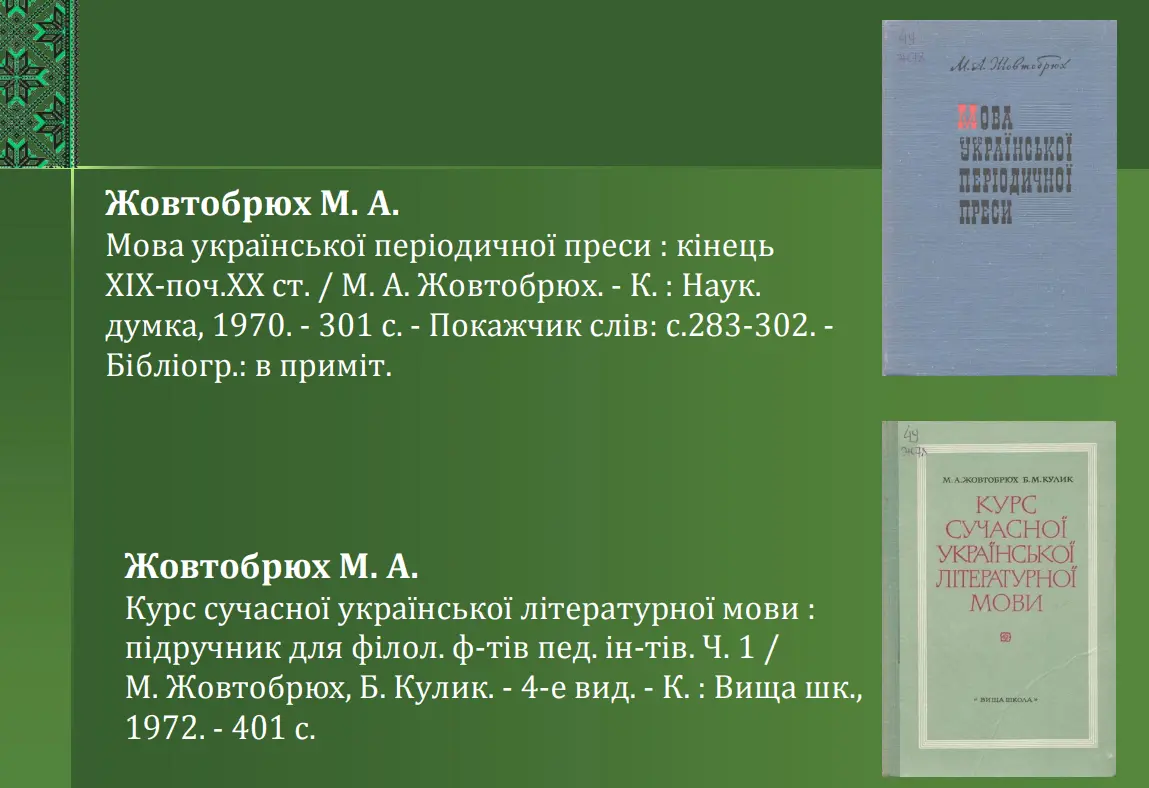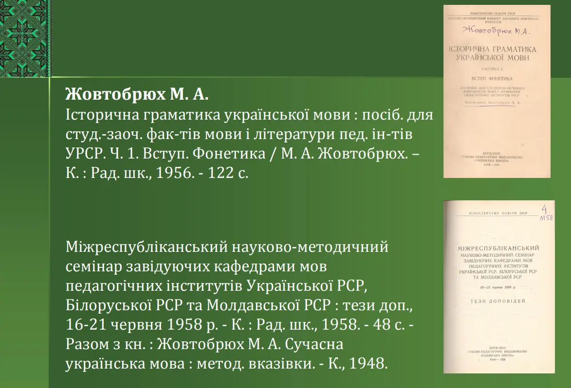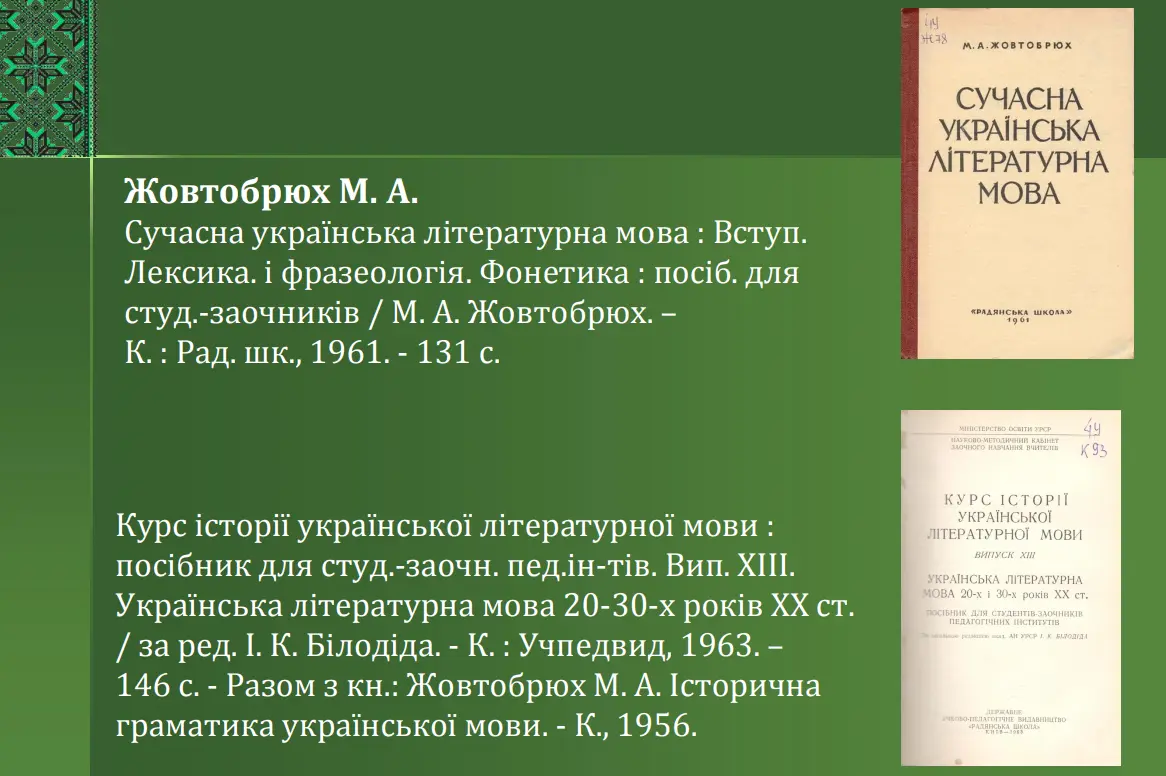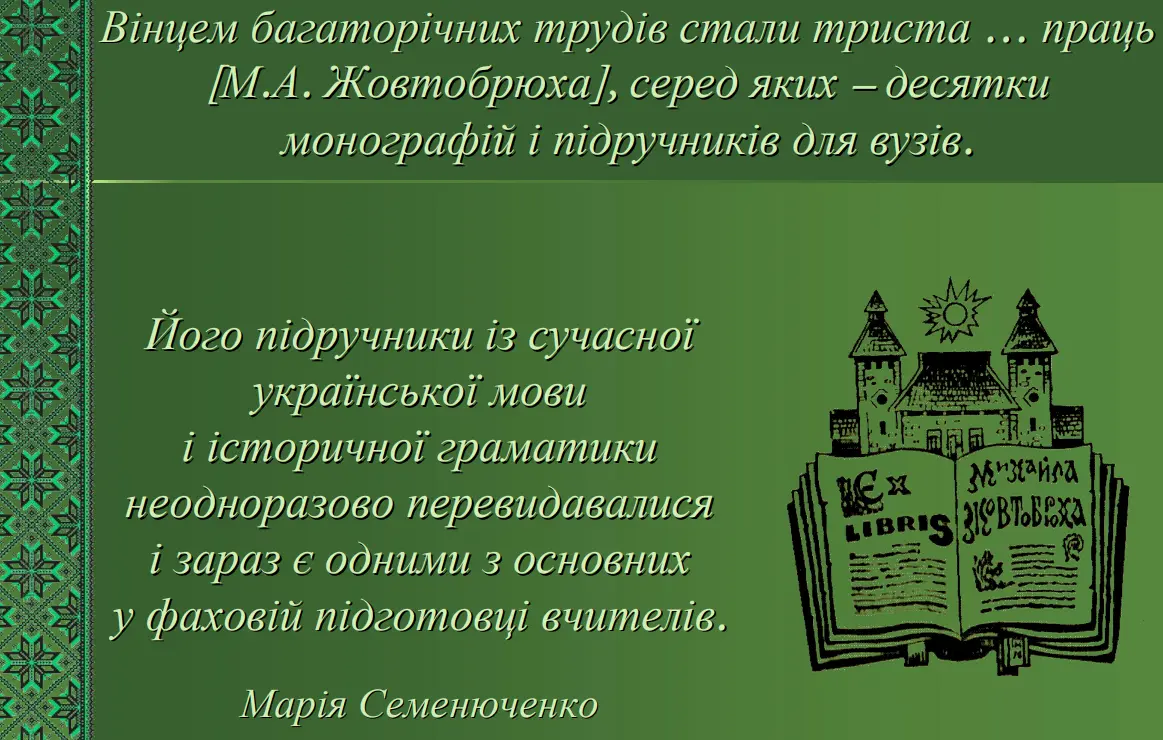 «…М. Жовтобрюх, – твердить професор Грищенко, – продовжив мовознавчо-викладацьку традицію свого попередника, виявив неабияку наполегливість і досяг визначних наукових результатів, поєднавши у своїй діяльності теоретичні пошуки і потреби щоденної практики, зокрема, належного змісту мовної освіти в середній та вищій школі і фахової підготовки вчителя української мови та літератури». Новим змістом наповнилася співпраця зі столичним інститутом у 1960–1964 рр. Михайло Жовтобрюх, тоді вже завідувач відділу теорії української літературної мови Інституту мовознавства, розкривав студентам української філології глибини курсу «Порівняльна граматика української і російської мови».