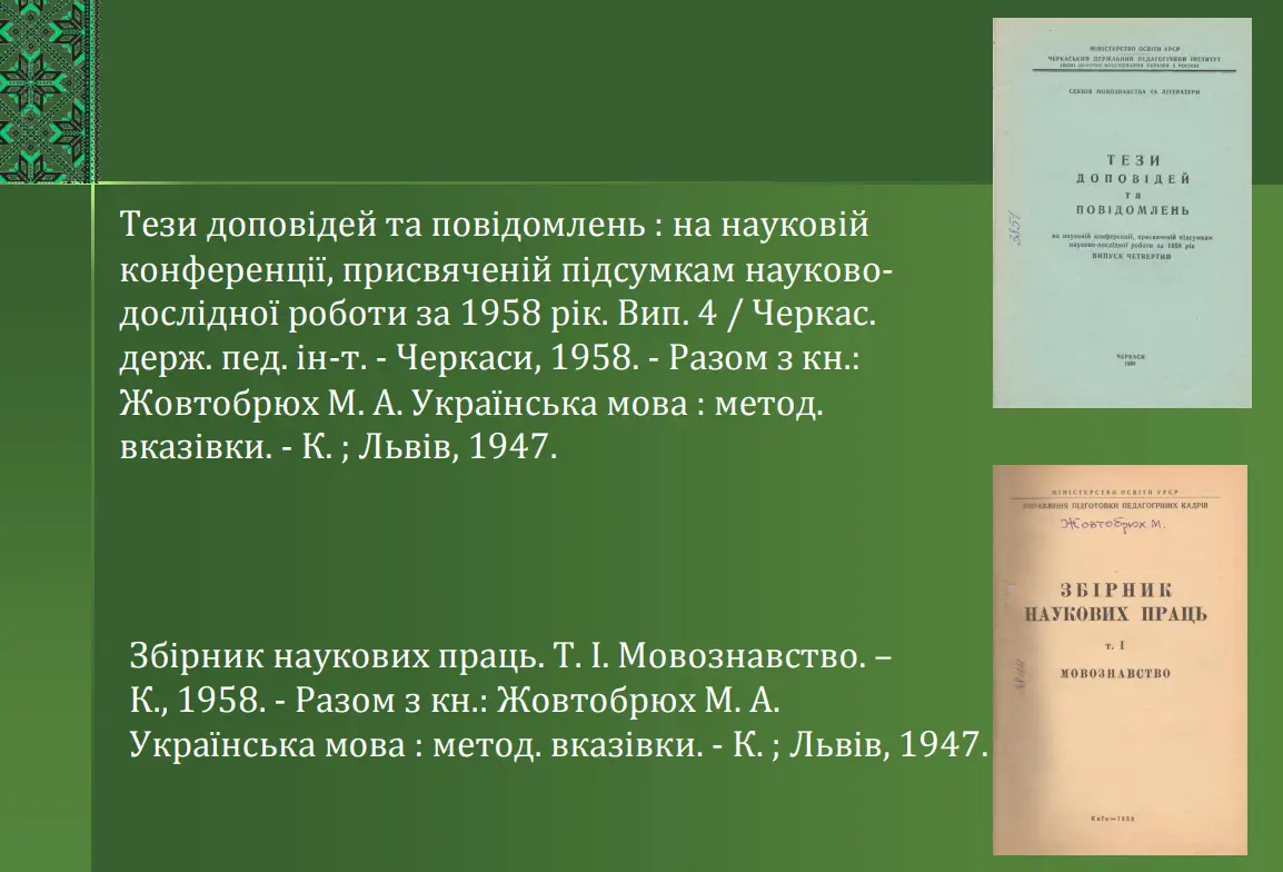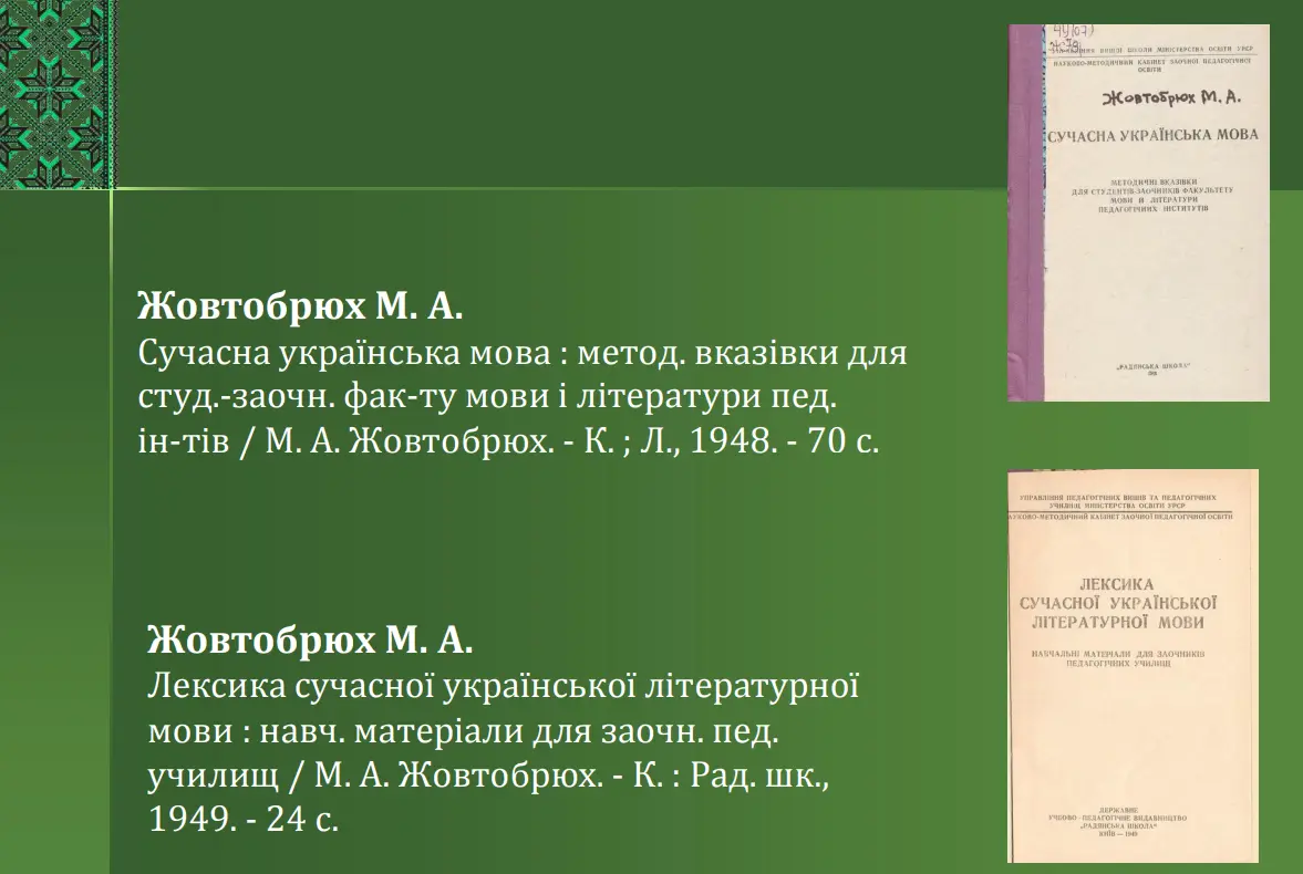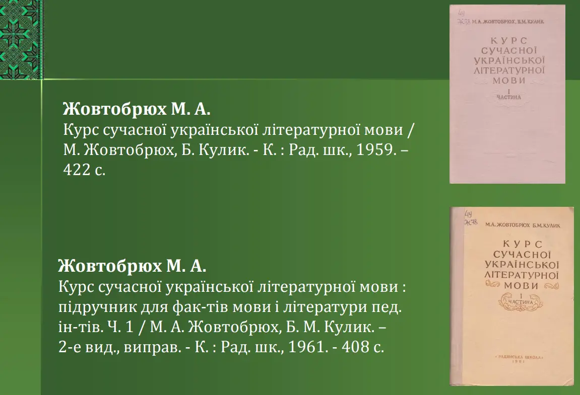 «…М. Жовтобрюх, – твердить професор Грищенко, – продовжив мовознавчо-викладацьку традицію свого попередника, виявив неабияку наполегливість і досяг визначних наукових результатів, поєднавши у своїй діяльності теоретичні пошуки і потреби щоденної практики, зокрема, належного змісту мовної освіти в середній та вищій школі і фахової підготовки вчителя української мови та літератури». Новим змістом наповнилася співпраця зі столичним інститутом у 1960–1964 рр. Михайло Жовтобрюх, тоді вже завідувач відділу теорії української літературної мови Інституту мовознавства, розкривав студентам української філології глибини курсу «Порівняльна граматика української і російської мови».