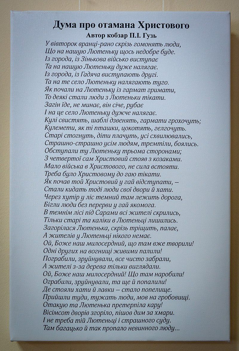 Текст думи авторства кобзаря Петра Гузя про отамана Христового у Лютенському музеї. Фото. poltava.to/project