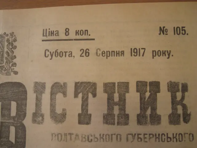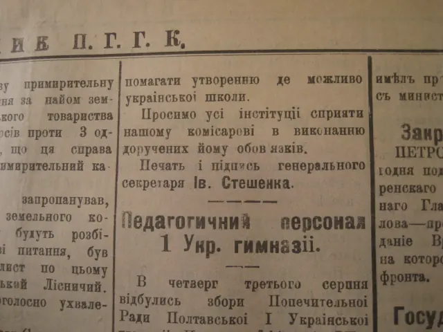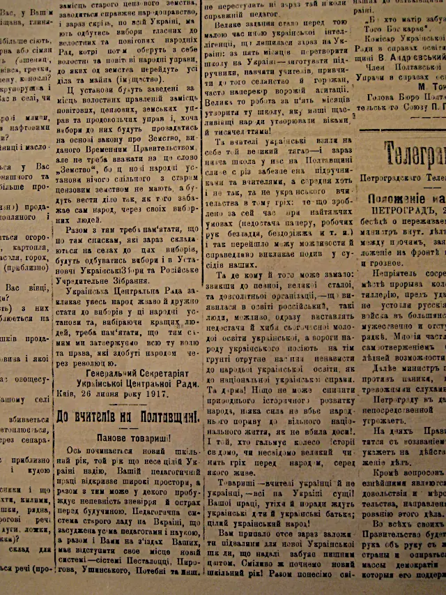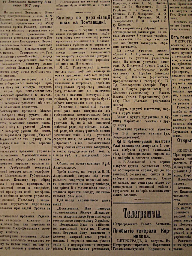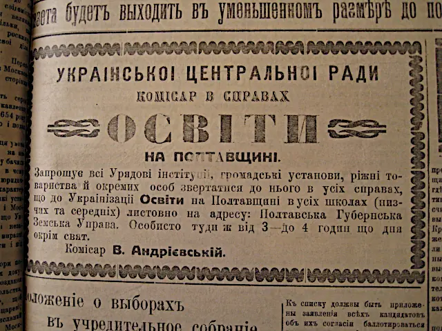Повідомлення Віктора Андрієвського як комісара освіти УНР на Полтавщині у газеті «Вістник Полтавського губернського громадського комітету» (№88 від 5 серпня1917)