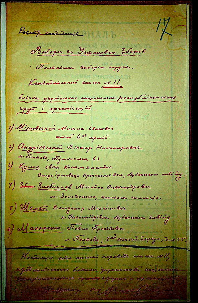 Кандидатський список №11 Блоку Українських Національно-Республіканських груп і організацій. Полтавська виборча округа [1917]. Держархів Полтавської обл., ф. -1066, оп.1, спр. 19, арк. 17