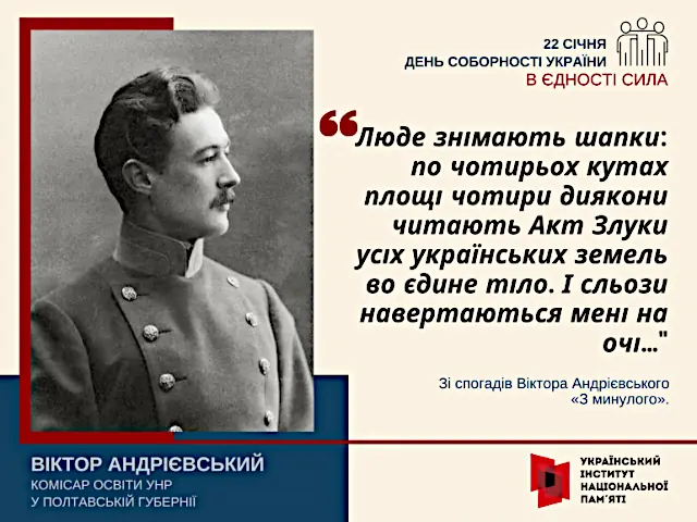 До речі, Андрієвський – учасник долесної події проголошення Соборності 22 січня 1919 року – Акту Злуки між УНР і ЗУНР. Зі спогадів: «От військові оркестри заграли «Ще не вмерла»! На дзвіниці Софії загув дзвін. Серед натовпу рух і чути голосне: «Слава!..Їдуть!..Їдуть!..То Директорія!..». Та от усе стихає, як на команду. Люде знімають шапки: по чотирьох кутах площі чотири диякони читають Акт Злуки усіх українських земель во єдине тіло. І сльози навертаються мені на очі…».