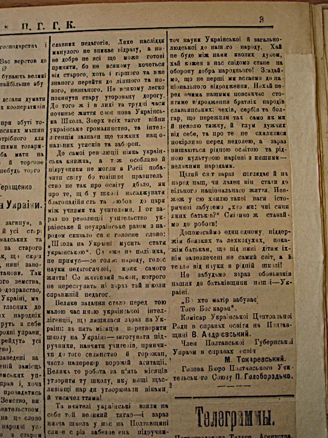 Крім того, делегати було направили вітальні телеграми до Києва, на адресу Центральної Ради, товариства шкільної освіти та кураторові Київської шкільної округи Миколі Василенку.