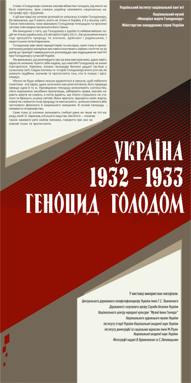 Виставка «Україна 1932-1933. Геноцид голодом» розповідає про історію Голодомору, яку повинні знати не лише в Україні, а й в усьому світі. Автори виставки з УІНП, Національного музею «Меморіал жертв Голодомору» й Міністерства закордонних справ України пояснюють, чому Голодомор є геноцидом та чому світове співтовариство має визнати його таким. Виставку можна також переглядати також на офіційному сайті УІНП за цим посиланням https://uinp.gov.ua/vystavkovi-proekty/vystavka-ukrayina-1932-1933-genocyd-golodom