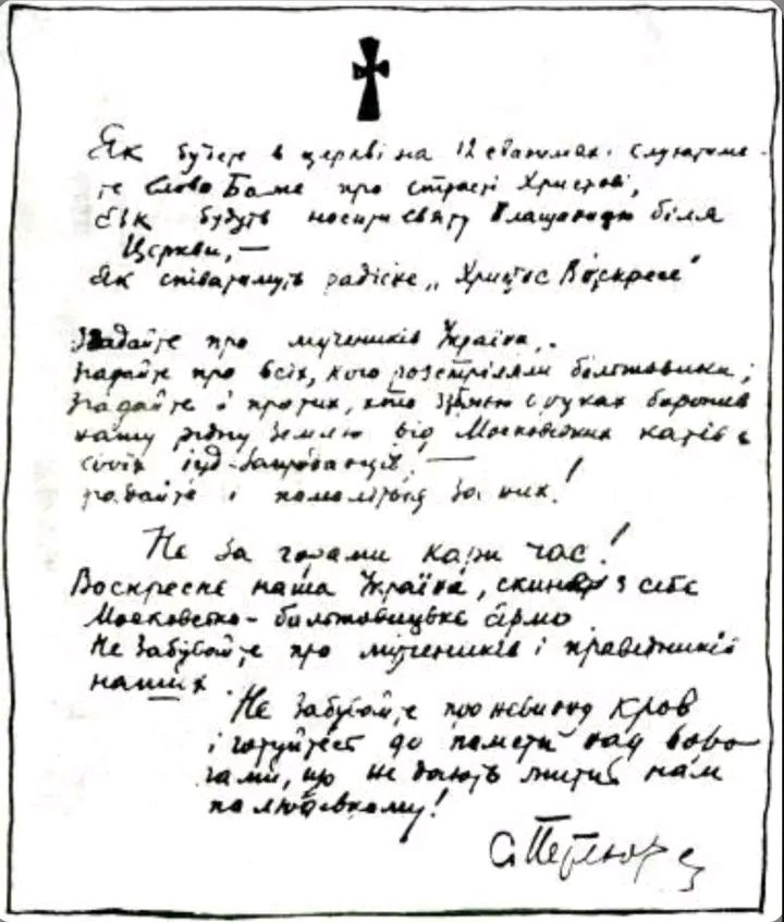 Звернення до українців Головного Отамана військ УНР, Симона Петлюри на Страсний тиждень 1926 року, за місяць до своєї мученицької смерті від рук московсько- більшовицького аґента. Звучить і нині, у час російсько-української Війни за Незалежність, як Заповіт! Далі цитата видатного уродженця Полтави.