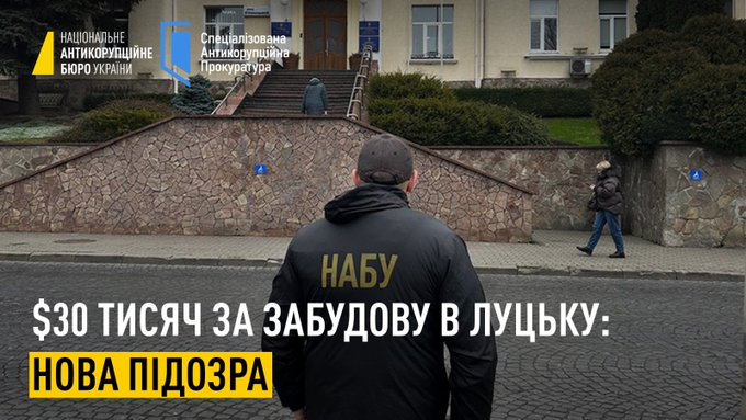 НАБУ і САП повідомили ще одному учаснику групи про підозру в отриманні хабаря після ухвалення міськрадою рішення про затвердження детального плану території в Луцьку. Йдеться про чинного на той час голову однієї із депутатських фракцій в Луцькій міській раді.