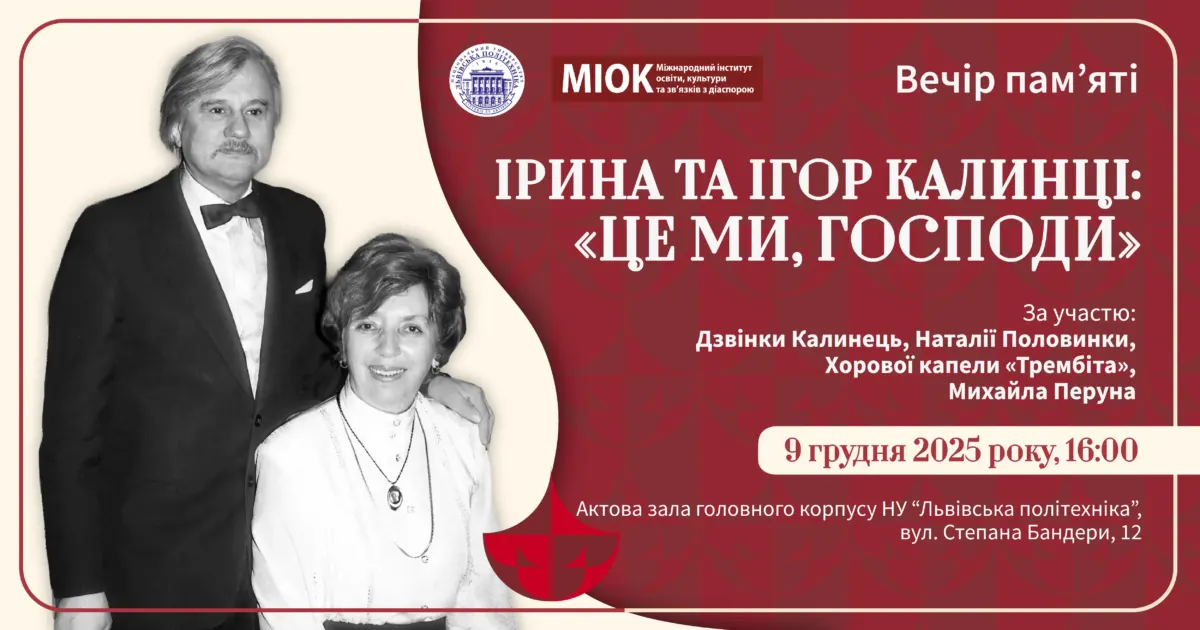 Що: вечір пам’яті з нагоди 85-ліття Ірини Калинець «Це ми, Господи», присвячений пам’яті Ірини та Ігоря Калинців.