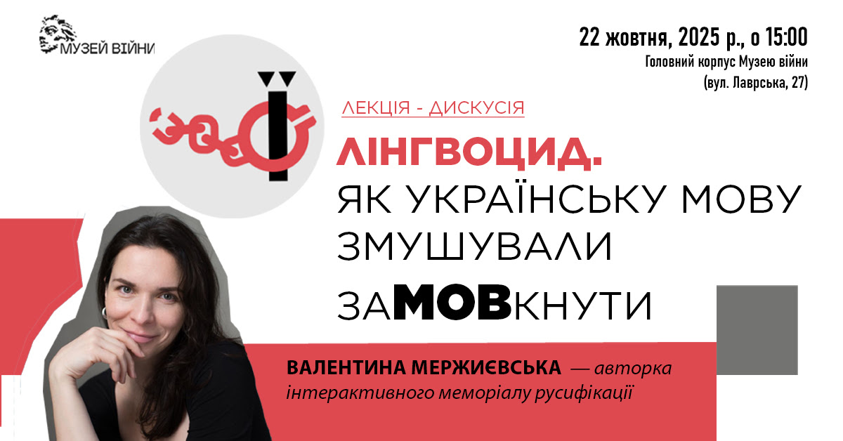 22 жовтня о 15:00 в Музеї війни відбудуться презентація освітнього проєкту «Лінгвоцид» і зустріч з авторкою цього проєкту, освітянкою, співзасновницею ГО «Валентність. Переосмислення» Валентиною Мержиєвською.