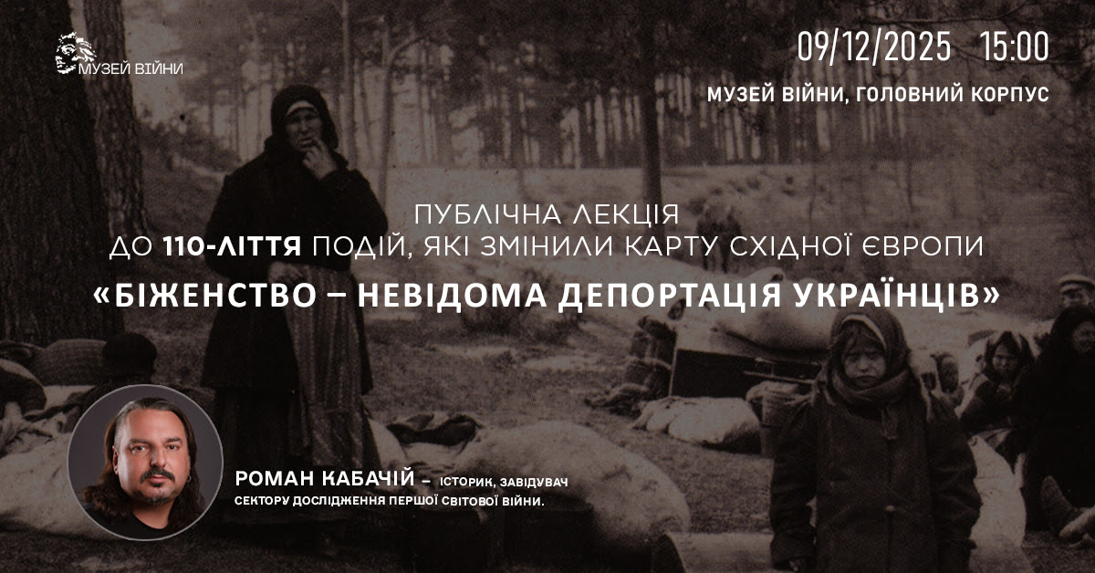 9 грудня 2025 р. Музей війни запрошує на лекцію «Біженство – невідома депортація українців», присвячену 110-й річниці масштабного примусового переселення цивільних під час Першої світової війни.