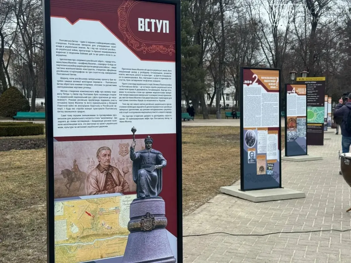 У 387-му річницю від дня народження Івана Мазепи — гетьмана Війська Запорозького, полководця, мецената, провідника антимосковського воєнно-політичного виступу Івана Мазепи в центрі Полтави урочисто відкрили вуличну постійно діючу виставку «Мазепа. Karl ХІІ. Пётр І. Топ-10 міфів ru.пропаганди». Вона є спільним проєктом Державного історико-культурного заповідника «Поле Полтавської битви», Українського інституту національної пам’яті (УІНП) та Полтавської міської ради. На церемонії відкриття промовляли митрополит Полтавський і Кременчуцький Федір, в.о. Полтавського міського голови Катерина Ямщикова, представник Українського інституту національної пам’яті в Полтавській області Олег Пустовгар та заступниця директора музею «Поле Полтавської битви» Людмила Шендрик.