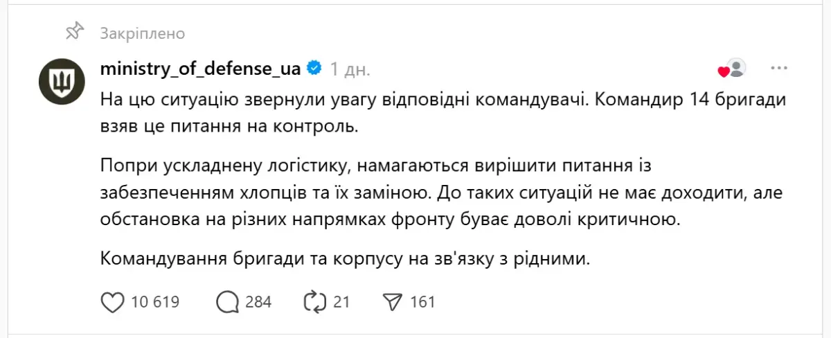 На допис відреагували в Міністерстві оборони: відповіли, що на ситуацію звернули увагу «відповідні командувачі», а командир 14 бригади «взяв це питання на контроль».