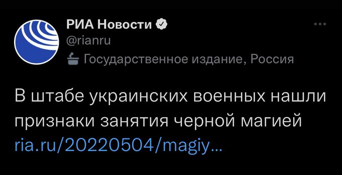 Російські пропагандисти з «риа новости» «знайшли» у штабі українських мінометників на околиці села Трьохізбенка ознаки заняття чорною магією: «освячену» зброю, позначки кров’ю та символ, що є «магічною печаткою темних сил, що поєднує в собі ідеї анархії, зброї та фашистської символіки»