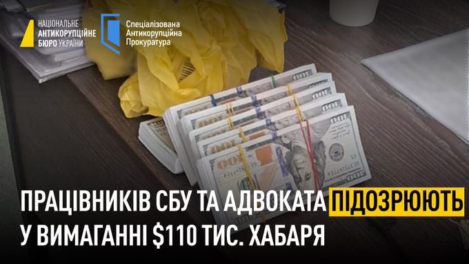 За даними слідства, службовці СБУ за посередництва адвоката вимагали у підприємця $110 тисяч.