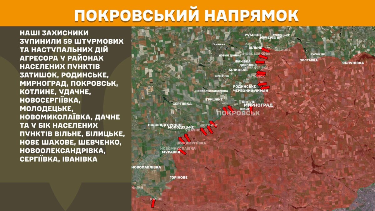 На Покровському напрямку наші захисники зупинили 59 штурмових та наступальних дій агресора у районах населених пунктів Затишок, Родинське, Мирноград, Покровськ, Котлине, Удачне, Новосергіївка, Молодецьке, Новомиколаївка, Дачне та у бік населених пунктів Вільне, Білицьке, Нове Шахове, Шевченко, Новоолександрівка, Сергіївка, Іванівка.
