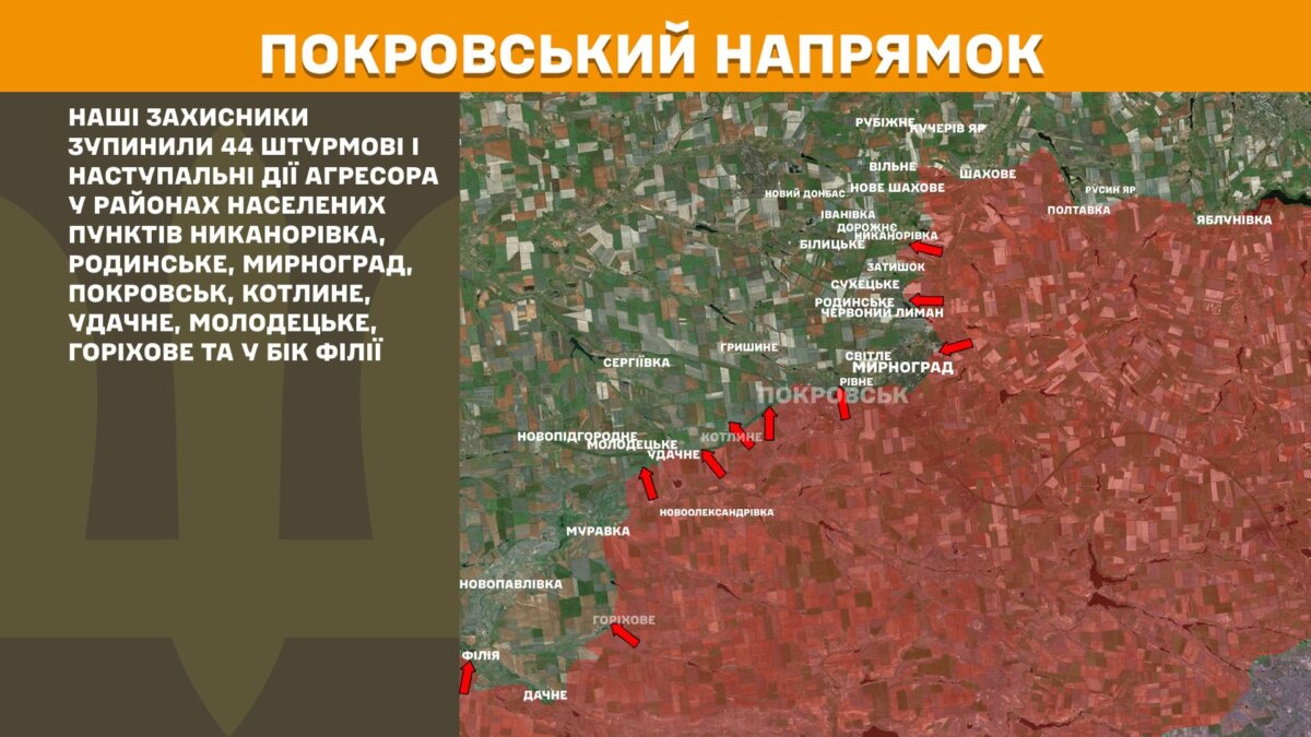 На Покровському напрямку наші захисники зупинили 44 штурмові і наступальні дії агресора у районах населених пунктів Никанорівка, Родинське, Мирноград, Покровськ, Котлине, Удачне, Молодецьке, Горіхове та у бік Філії.