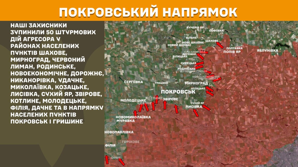 На Покровському напрямку наші захисники зупинили 50 штурмових дій агресора у районах населених пунктів Шахове, Мирноград, Червоний Лиман, Родинське, Новоекономічне, Дорожнє, Никанорівка, Удачне, Миколаївка, Козацьке, Лисівка, Сухий Яр, Звірове, Котлине, Молодецьке, Філія, Дачне та в напрямку населених пунктів Покровськ і Гришине.