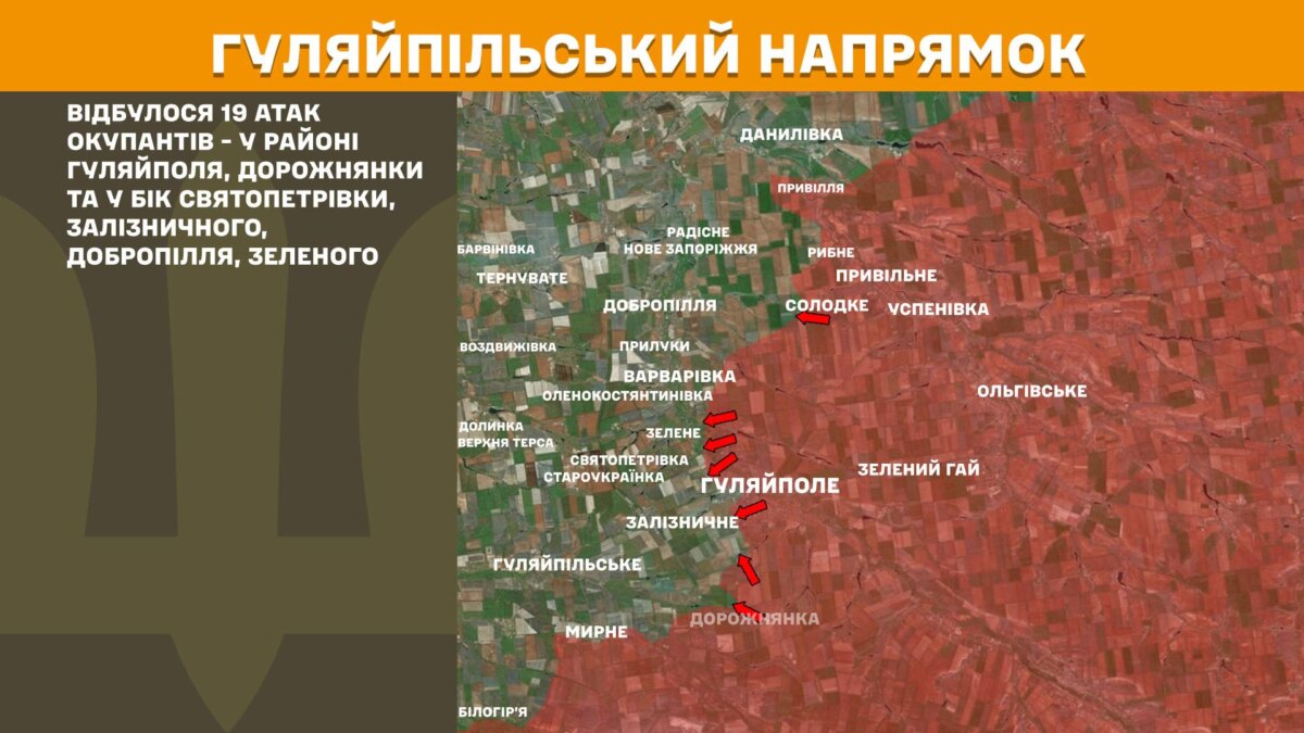 На Гуляйпільському напрямку відбулося 19 атак окупантів – у районі Гуляйполя, Дорожнянки та у бік Святопетрівки, Залізничного, Добропілля, Зеленого.