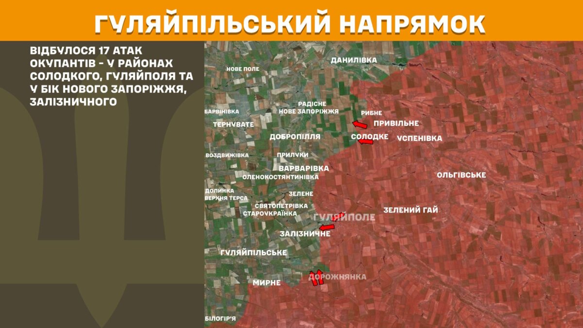 На Гуляйпільському напрямку відбулося 17 атак окупантів – у районах Солодкого, Гуляйполя та у бік Нового Запоріжжя, Залізничного.