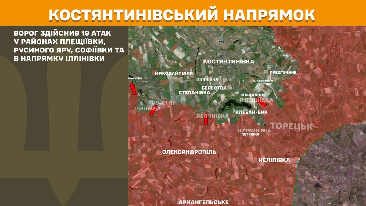 На Костянтинівському напрямку ворог здійснив 19 атак у районах Плещіївки, Русиного Яру, Софіївки та в напрямку Іллінівки.