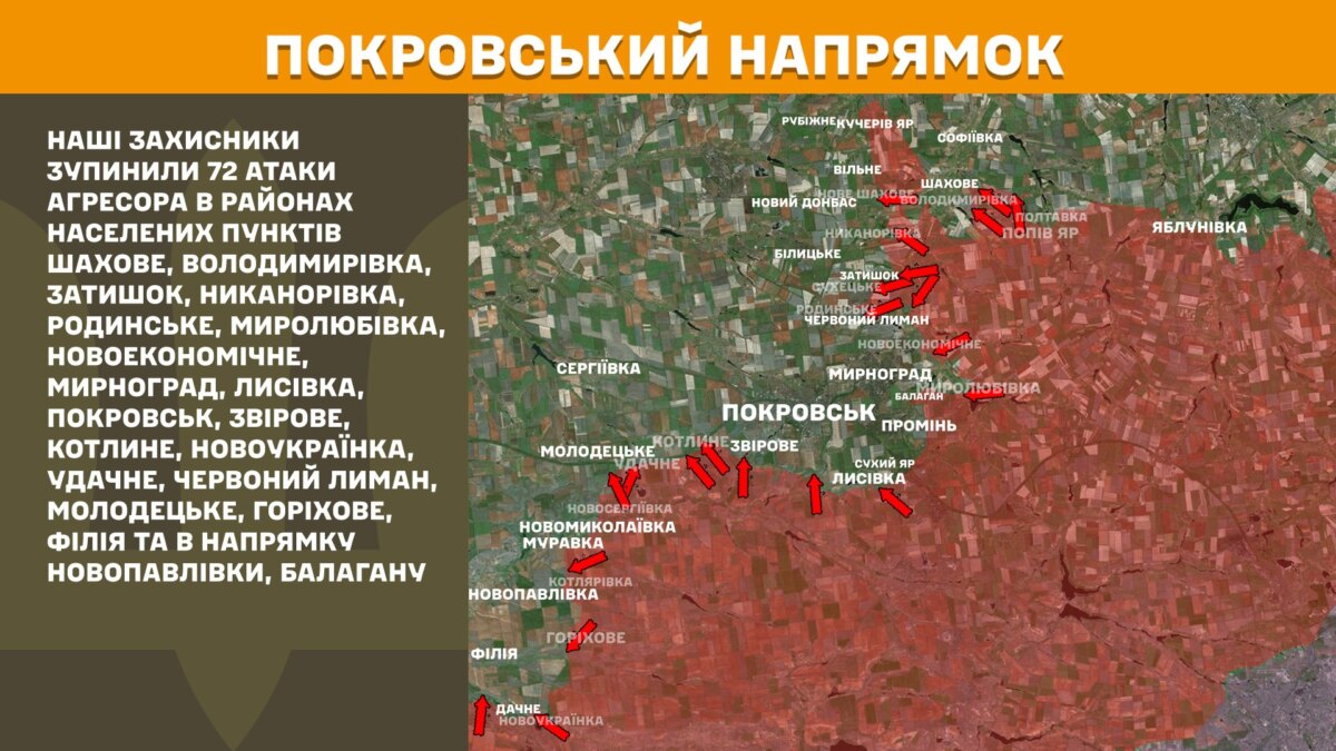 На Покровському напрямку наші захисники зупинили 72 атаки агресора в районах населених пунктів Шахове, Володимирівка, Затишок, Никанорівка, Родинське, Миролюбівка, Новоекономічне, Мирноград, Лисівка, Покровськ, Звірове, Котлине, Новоукраїнка, Удачне, Червоний Лиман, Молодецьке, Горіхове, Філія та в напрямку Новопавлівки, Балагану.