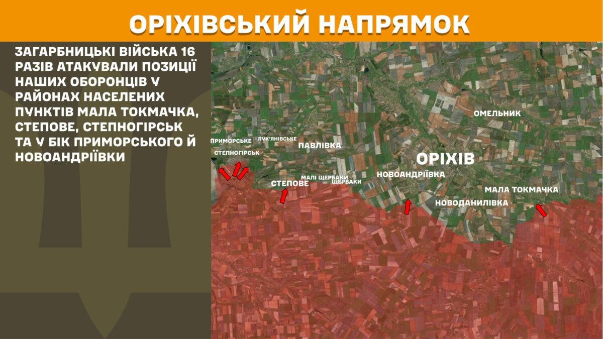 На Оріхівському напрямку загарбницькі війська 16 разів атакували позиції наших оборонців у районах населених пунктів Мала Токмачка, Степове, Степногірськ та у бік Приморського й Новоандріївки.