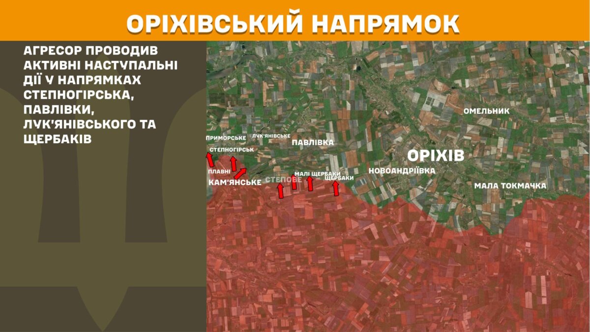 На Оріхівському напрямку агресор проводив активні наступальні дії у напрямках Степногірська, Павлівки, Лук’янівського та Щербаків.