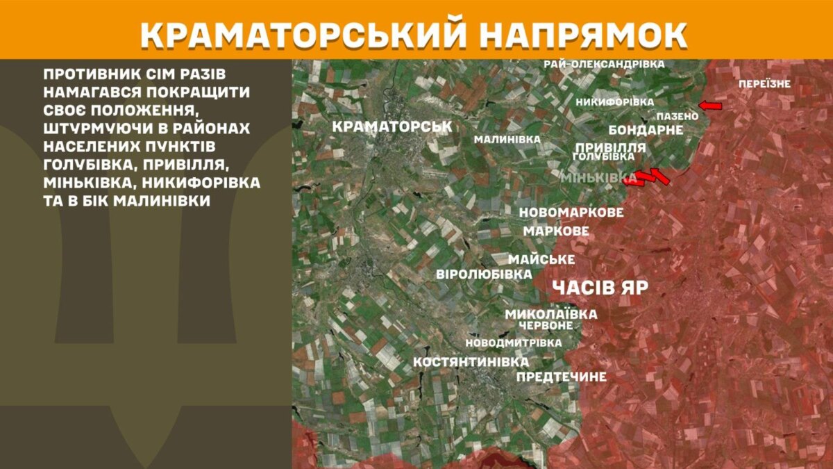 На Краматорському напрямку противник сім разів намагався покращити своє положення, штурмуючи в районах населених пунктів Голубівка, Привілля, Міньківка, Никифорівка та в бік Малинівки.