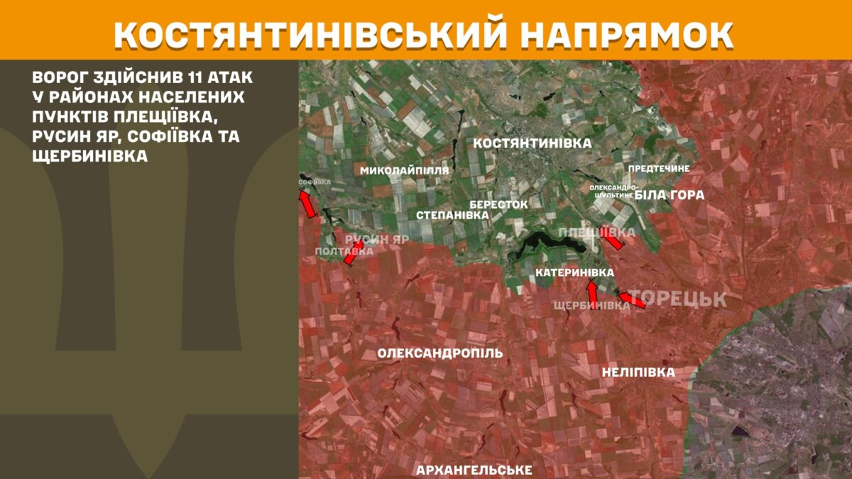 На Костянтинівському напрямку ворог здійснив 11 атак у районах населених пунктів Плещіївка, Русин Яр, Софіївка та Щербинівка.