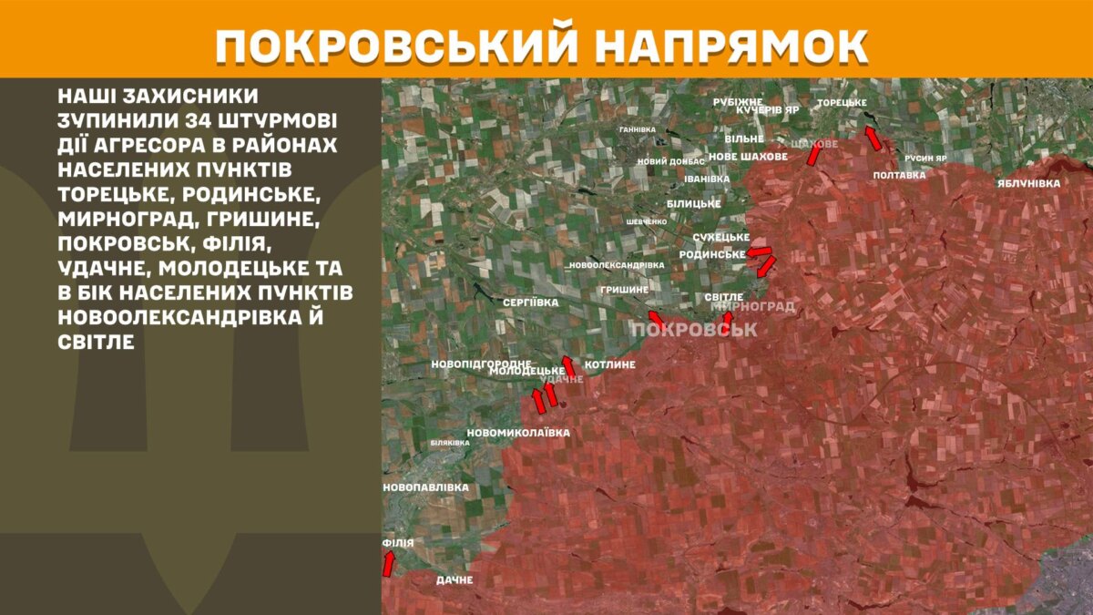 На Покровському напрямку наші захисники зупинили 34 штурмові дії агресора в районах населених пунктів Торецьке, Родинське, Мирноград, Гришине, Покровськ, Філія, Удачне, Молодецьке та в бік населених пунктів Новоолександрівка й Світле.