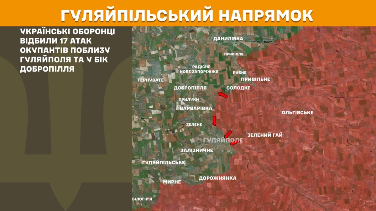 На Гуляйпільському напрямку українські оборонці відбили 17 атак окупантів поблизу Гуляйполя та у бік Добропілля.